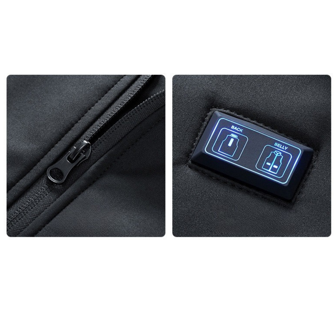 It features built-in heating elements powered by a rechargeable power bank, providing instant, adjustable warmth at the press of a button.